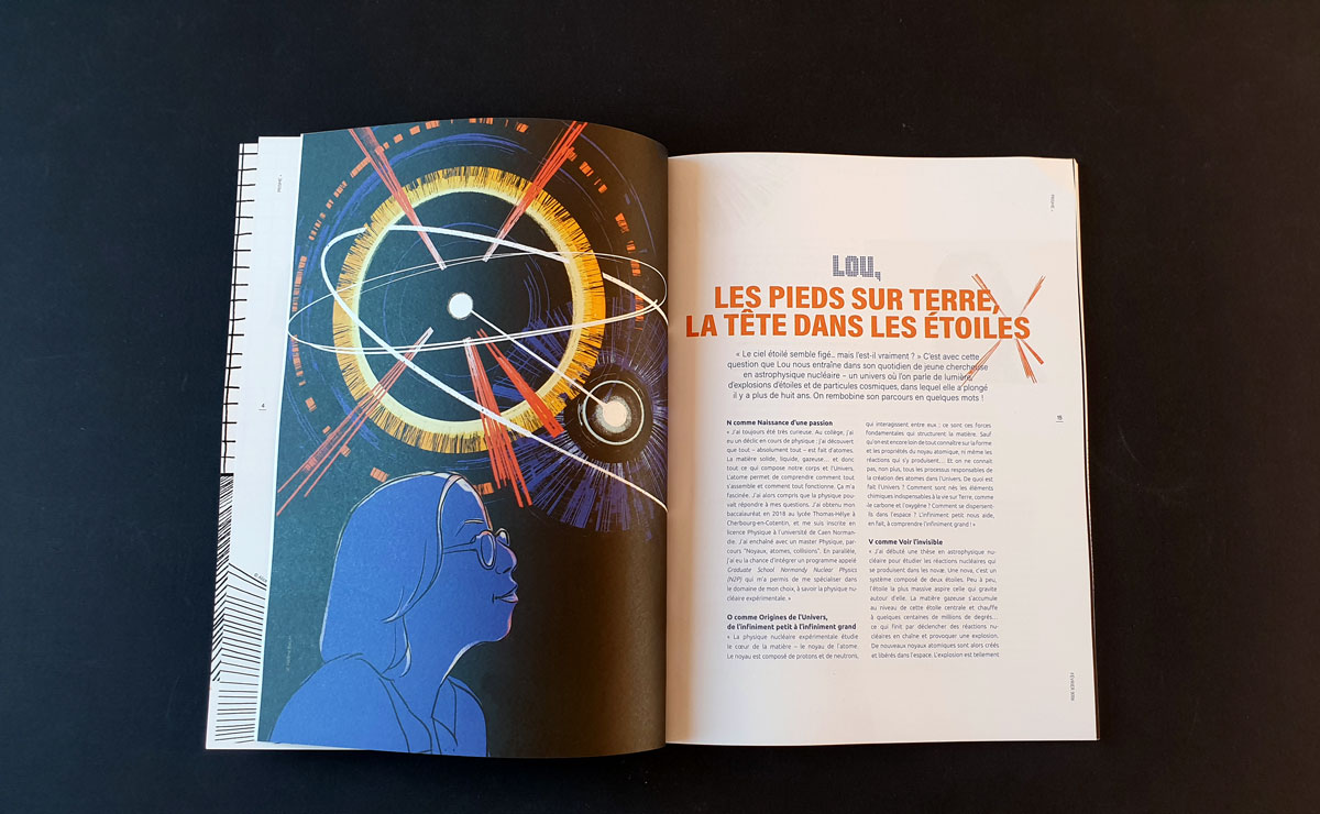 Portrait de la jeune chercheuse normande qui réalise une thèse en astrophysique. Pour expliquer sa démarche, elle compare les activités infinitésimales au coeur de la matière à celles des étoiles : les novae. À leur mort, elles explosent et dégagent une énergie colossale. Ce parallèle entre l’infiniment grand et le minuscule qui prête à méditer m’a inspiré ce visuel où je présente la jeune femme la tête… dans les étoiles !